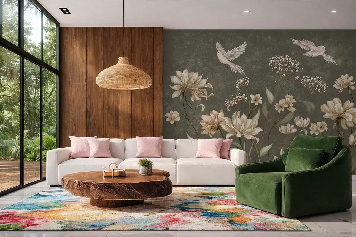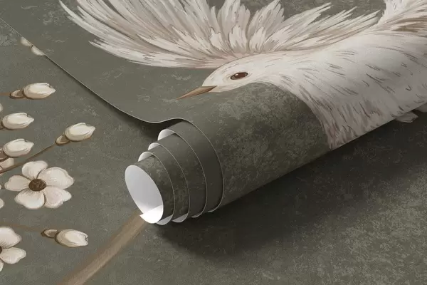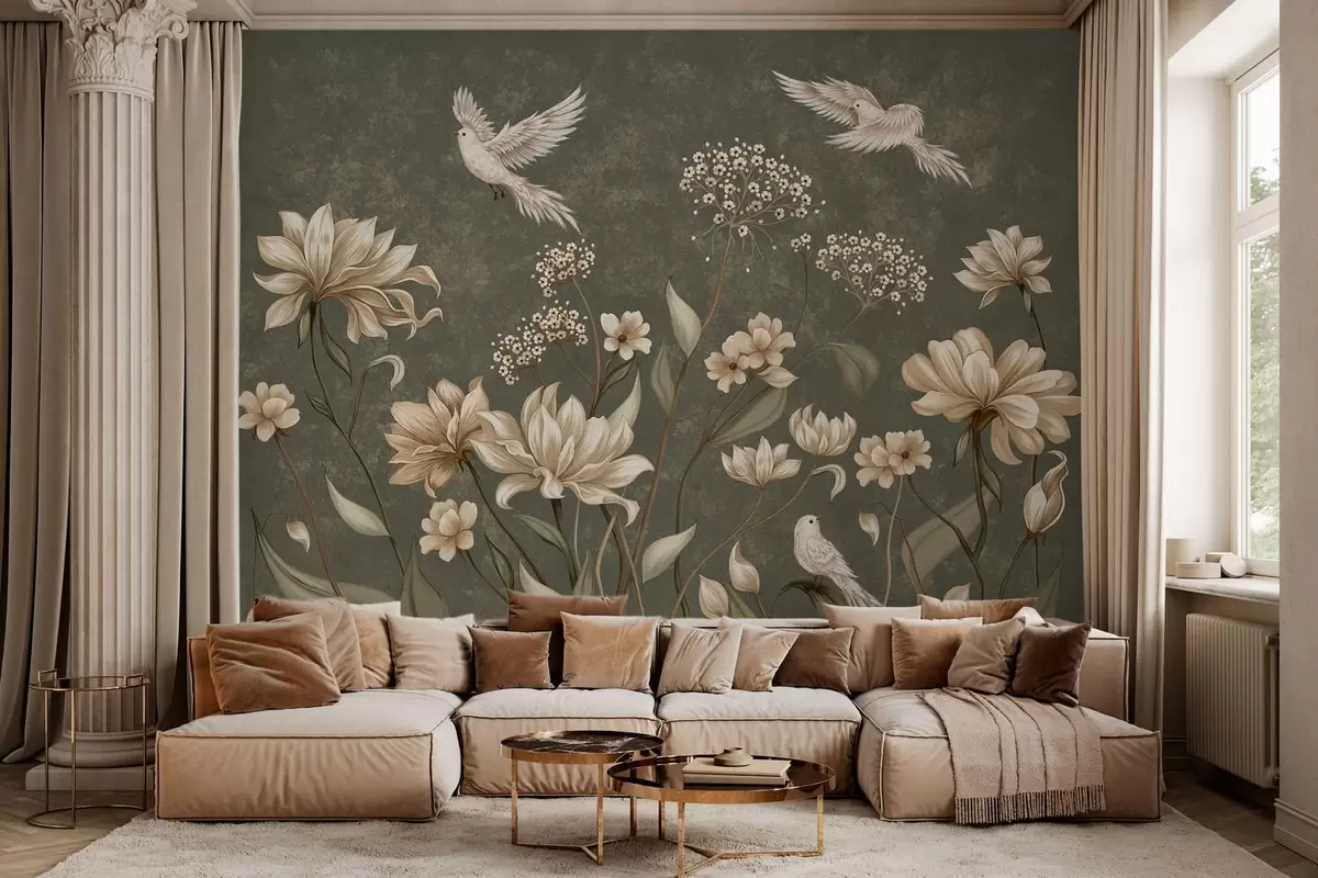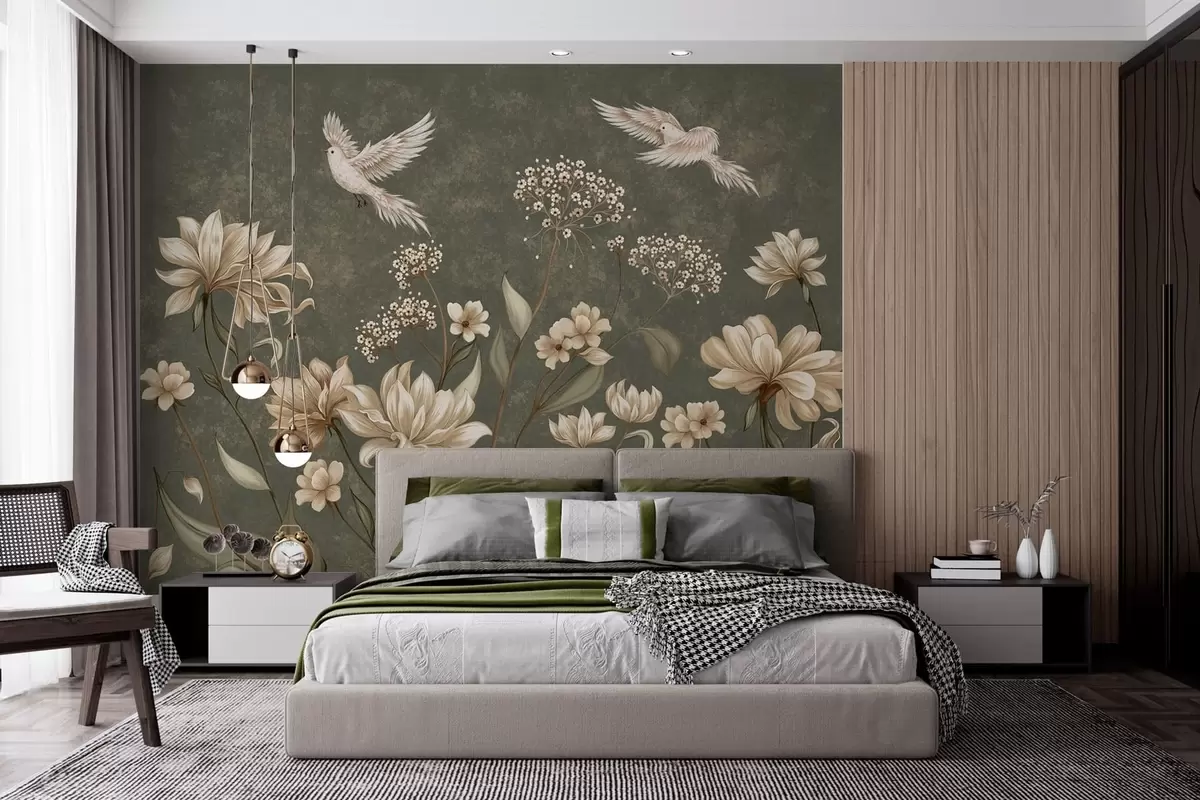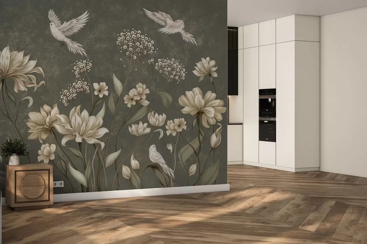 Fototapet Flori și păsări pe un fundal verde închis Nr. w05118v3