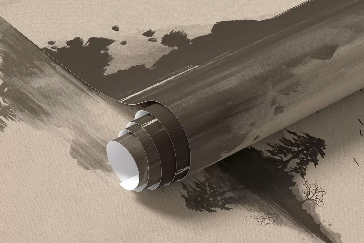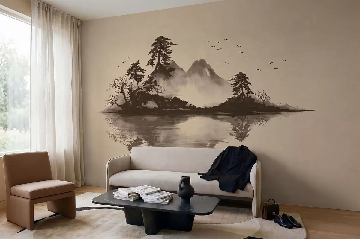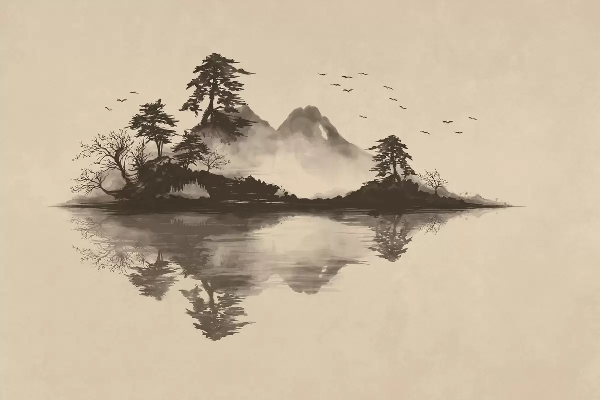 Fototapet Peisaj montan în stil sumi-e, cu pini și reflexie Nr. w05124