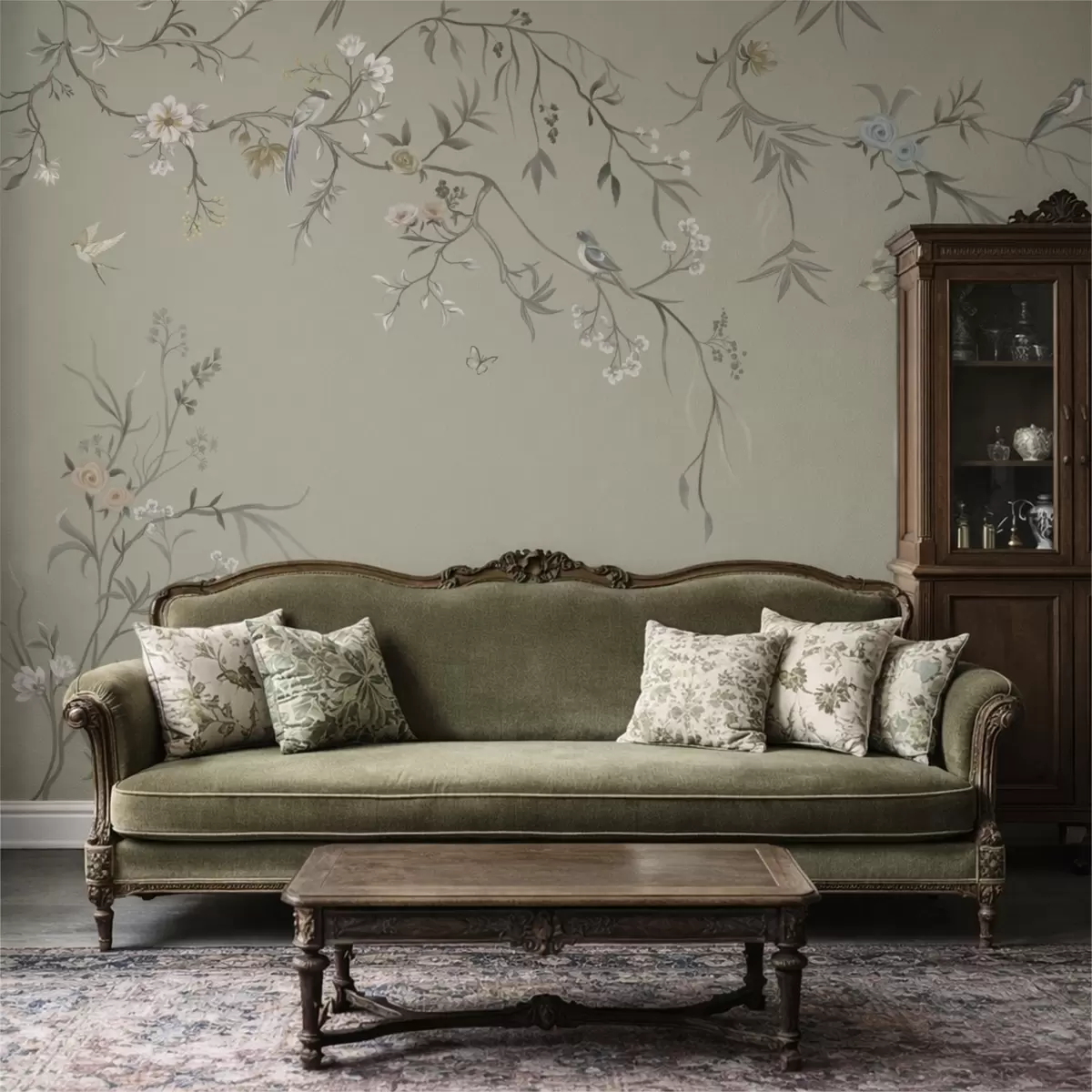 Fototapet Model floral cu păsări pe fundal rece Nr. w05127v6