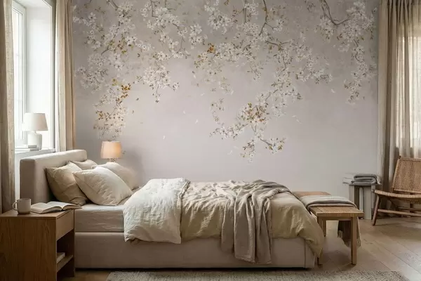 Fototapet Ramuri cu flori albe pe un fundal bej deschis Nr. w05129