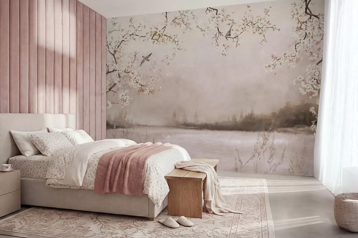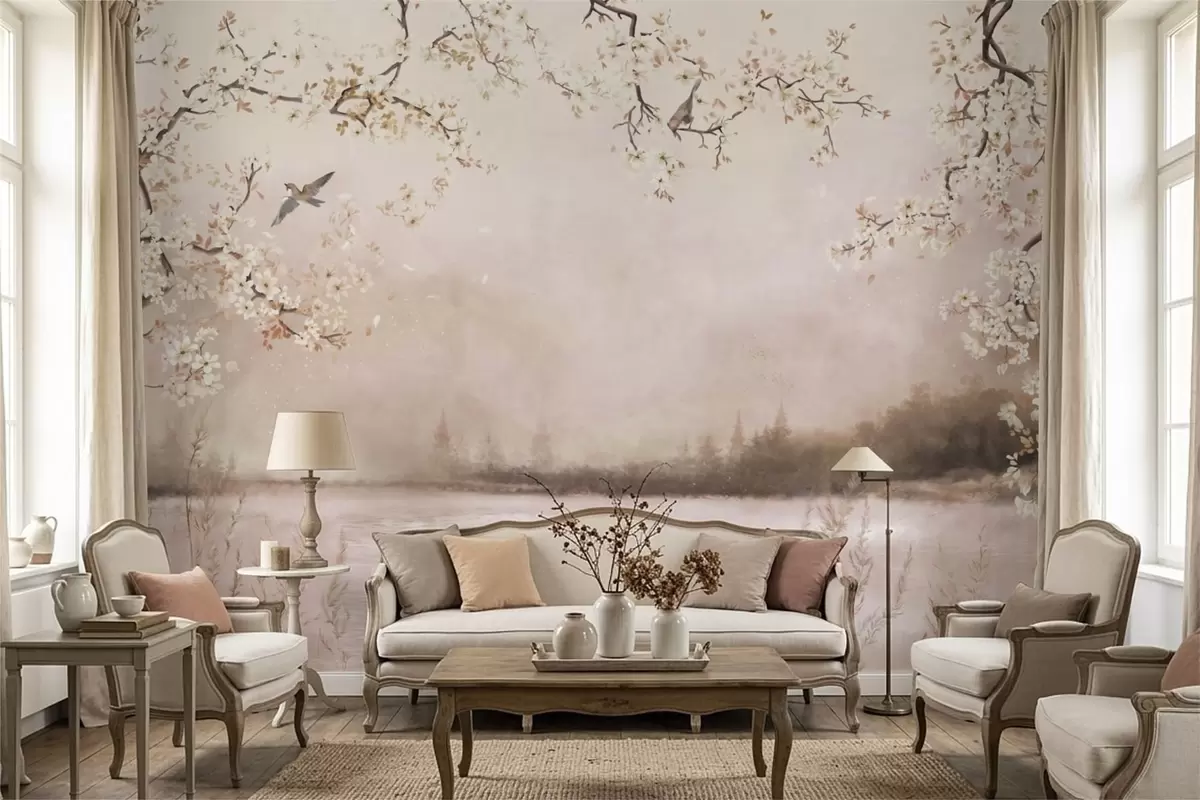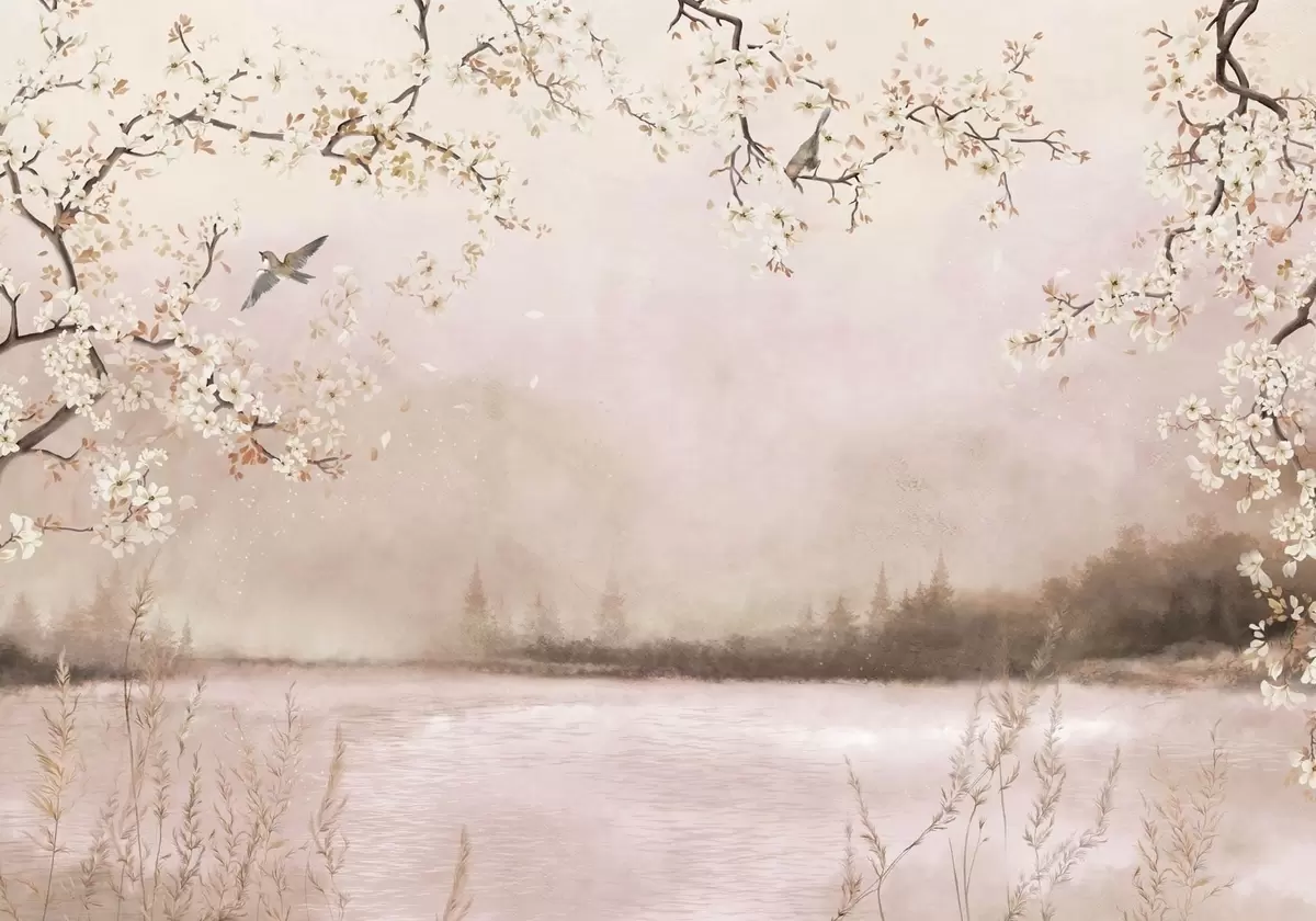 Fototapet Ramuri înflorite deasupra unui lac liniștit, cu păsări în ceață Nr. w05155v1