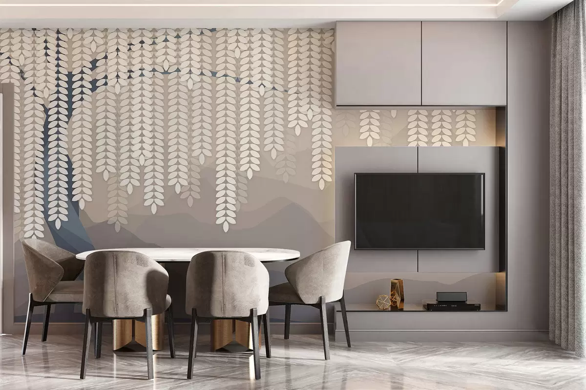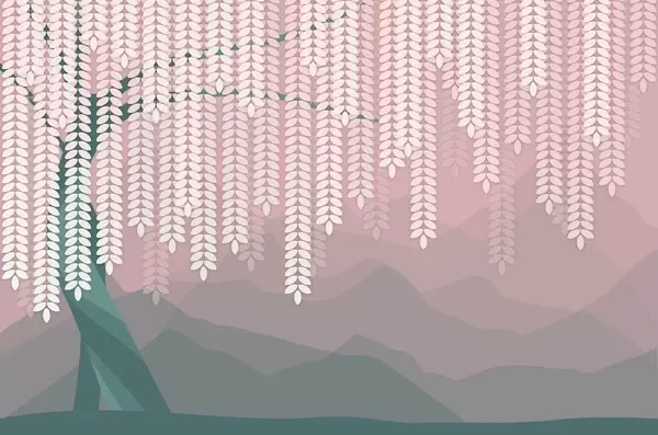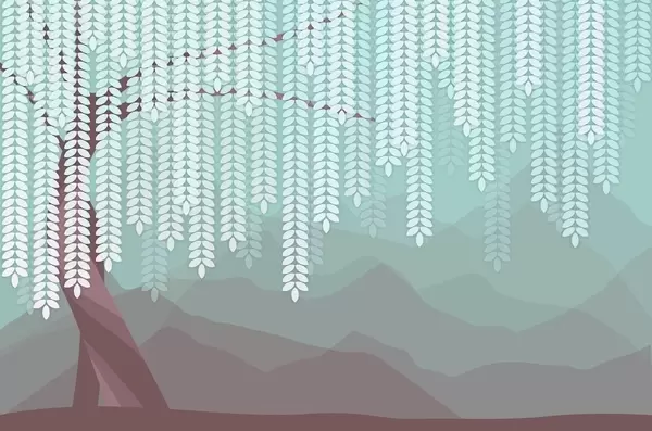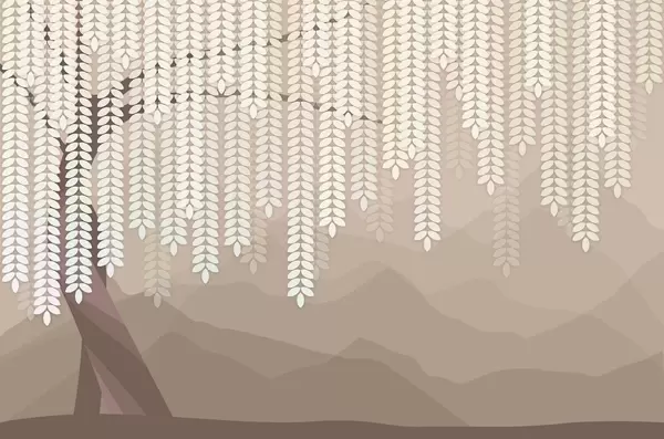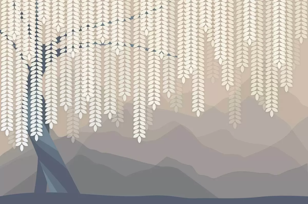 Fototapet salcie stilizată cu frunze atârnate pe fundalul unor munți minimalisti în nuanțe de bej și albastru-verde Nr. w05232