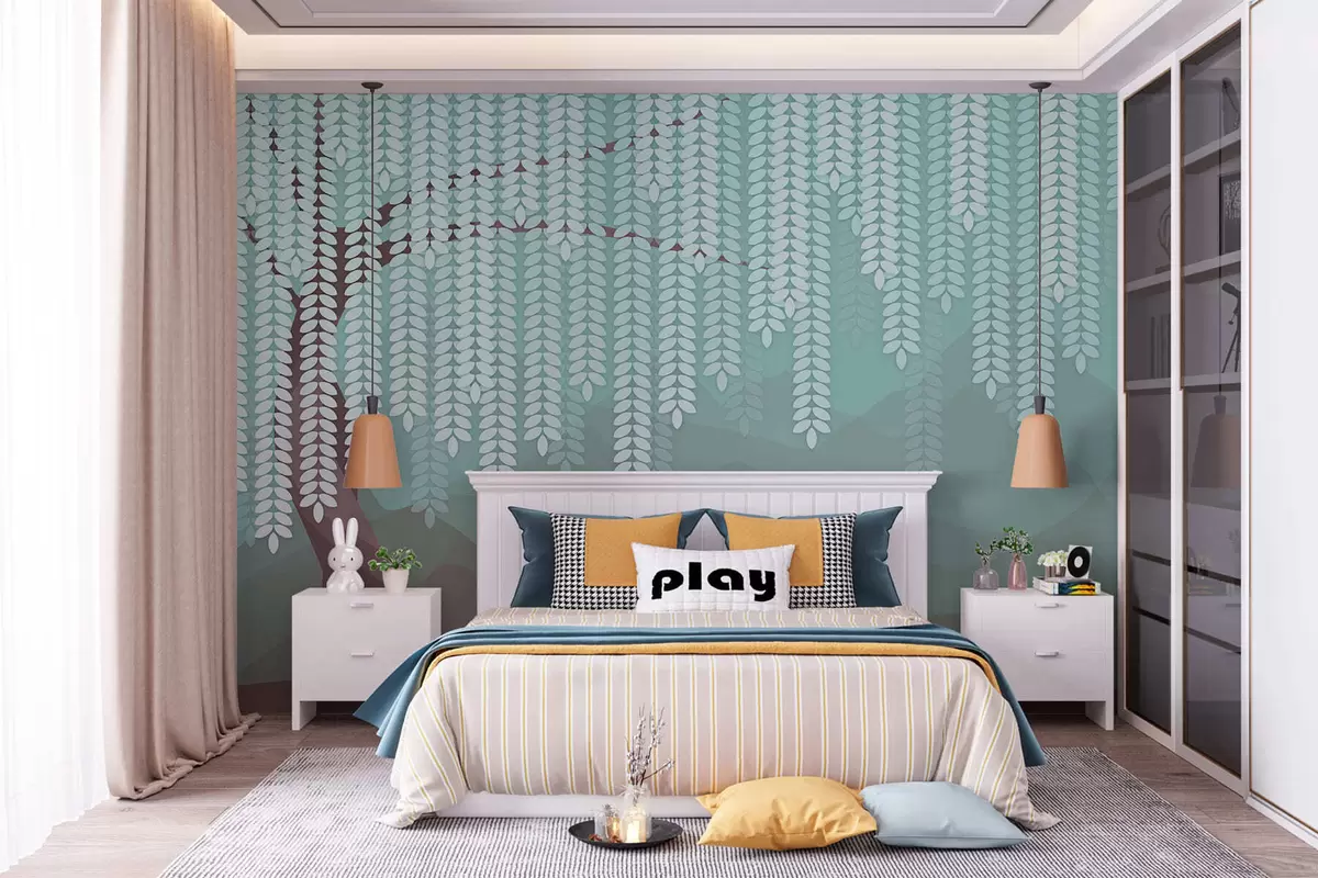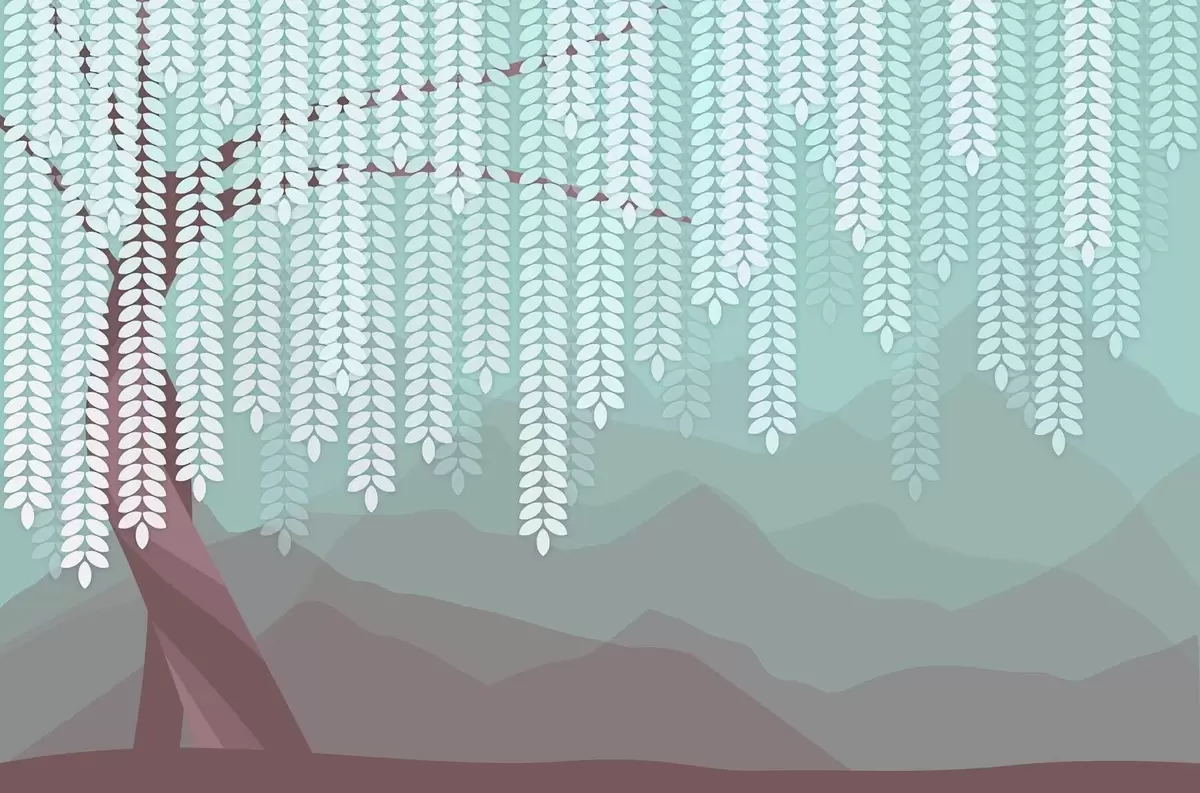 Fototapet salcie stilizată cu frunze atârnate pe fundalul unor munți minimalisti în nuanțe de ciocolată și turcoaz Nr. w05232v1