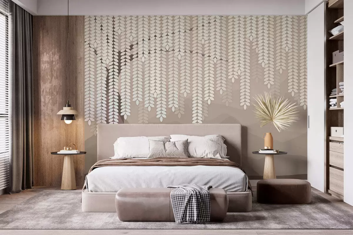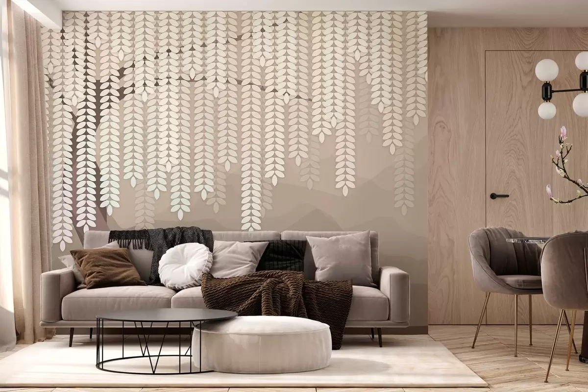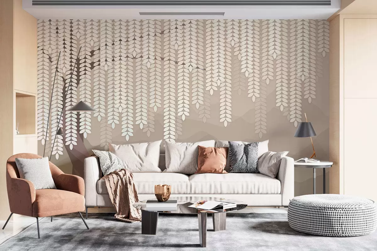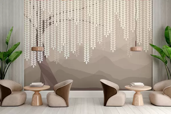 Fototapet salcie stilizată cu frunze atârnate pe fundalul unor munți minimalisti în nuanțe de cafea Nr. w05232v2