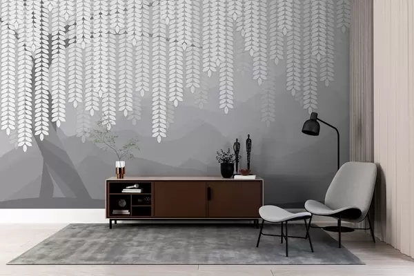 Fototapet salcie stilizată cu frunze atârnate pe fundalul unor munți minimalisti în nuanțe de gri Nr. w05232v3