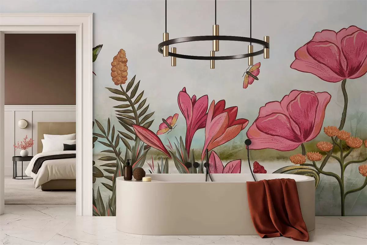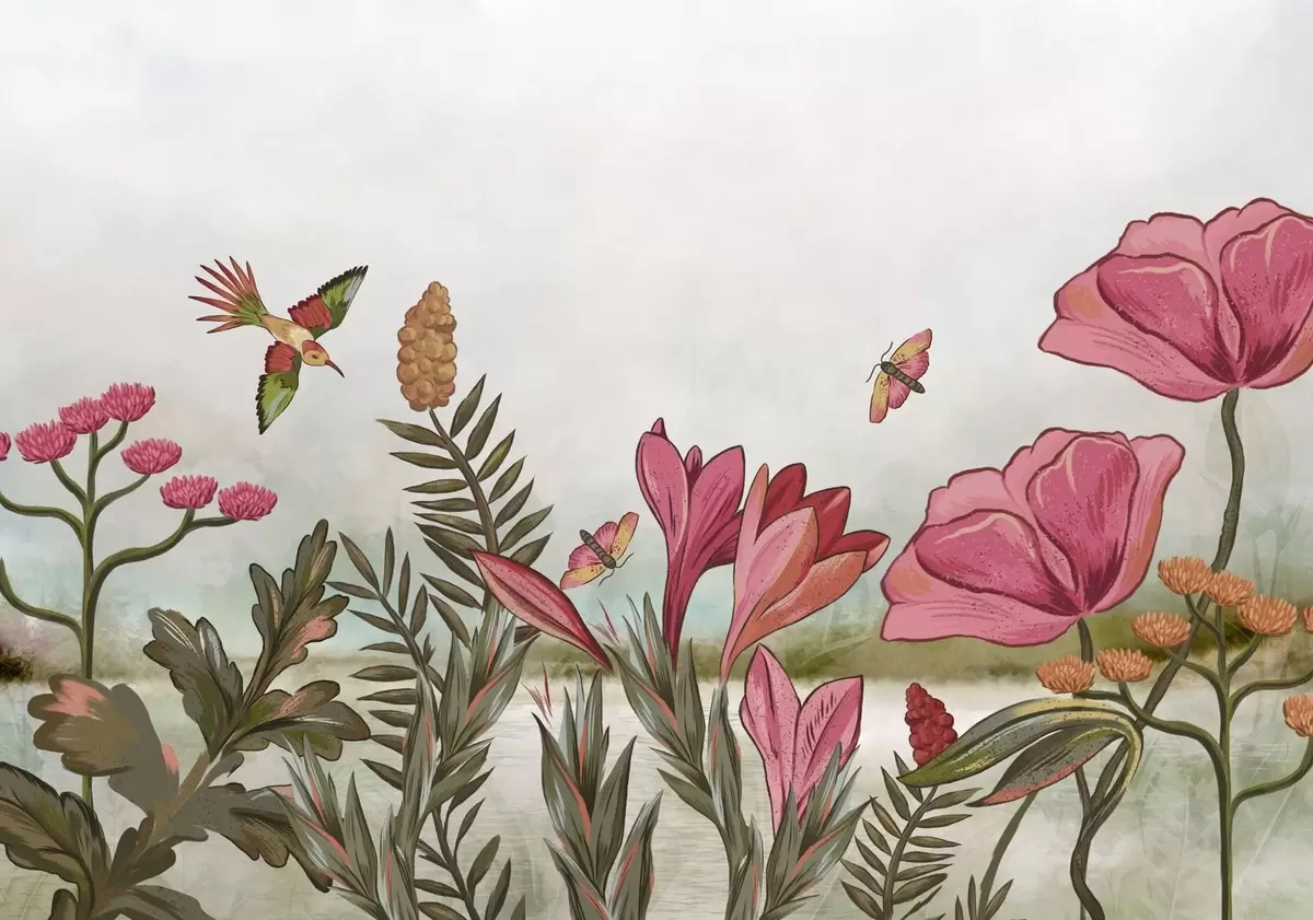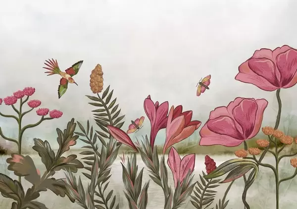 Fototapet Flori strălucitoare cu păsări și fluturi Nr. w05321