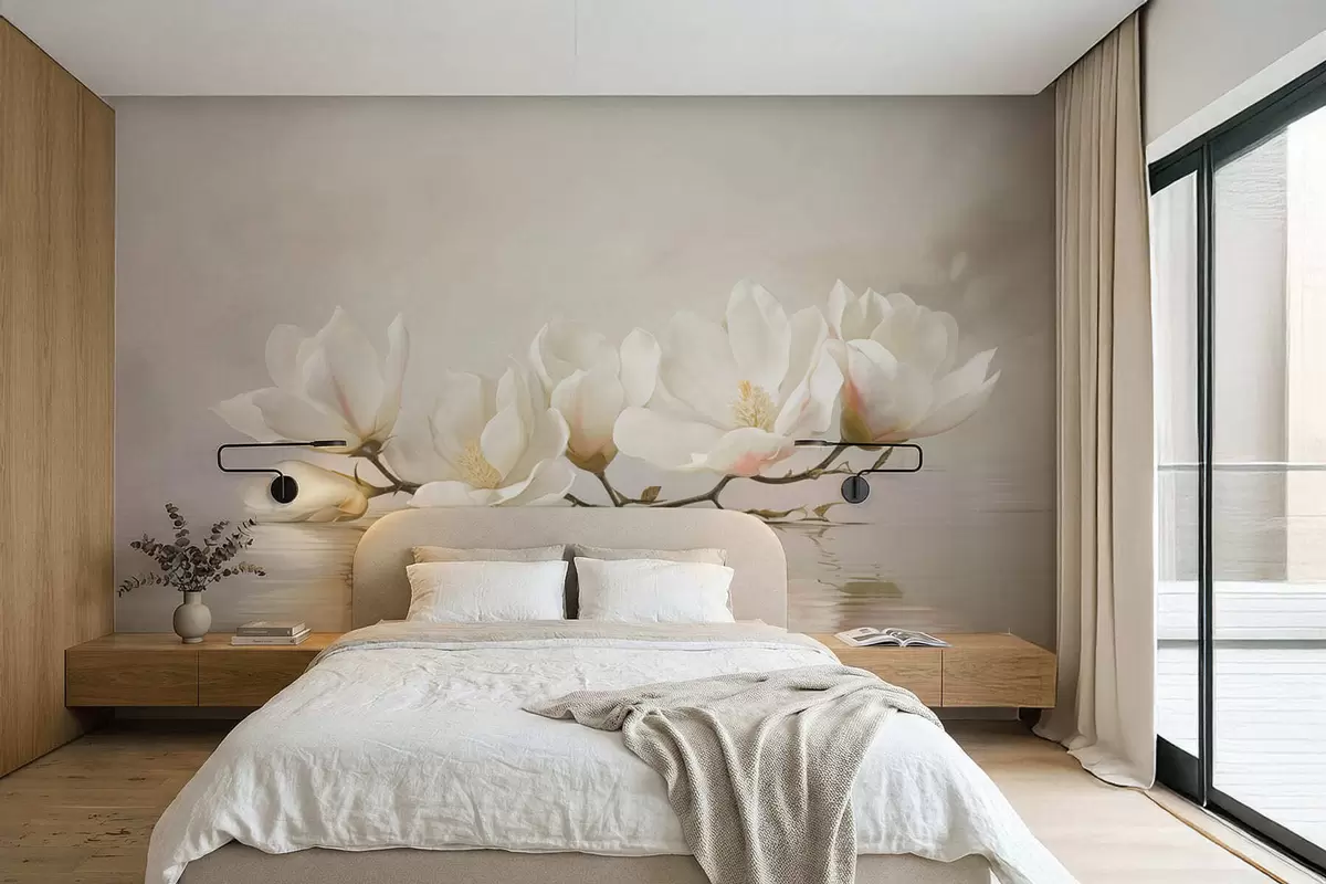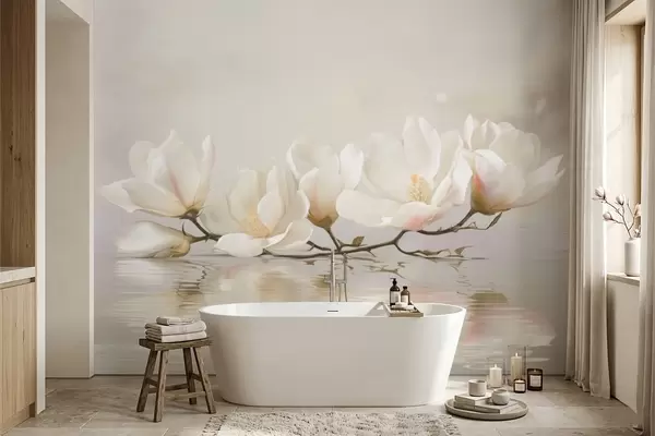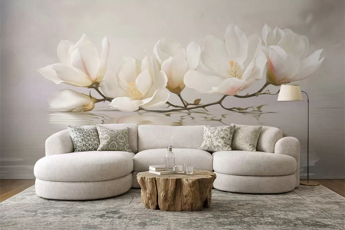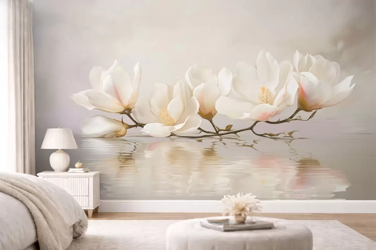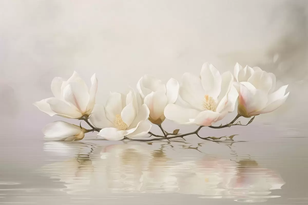 Fototapet Flori de magnolie deschise pe o ramură deasupra reflexiei apei Nr. w05353