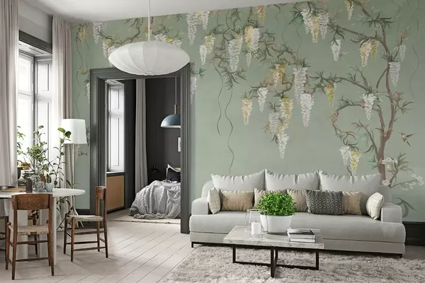 Fototapet Ramuri înflorite cu flori albe și păsări pe fond verde Nr. w05394