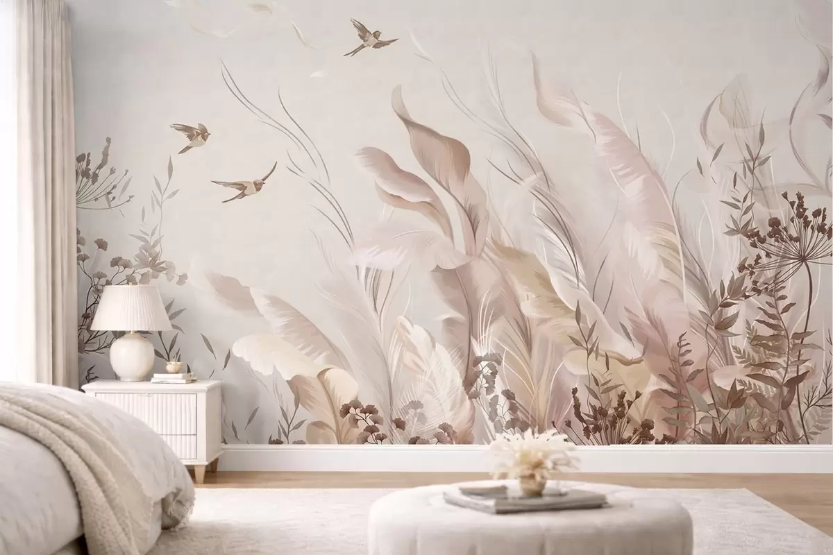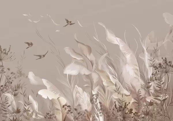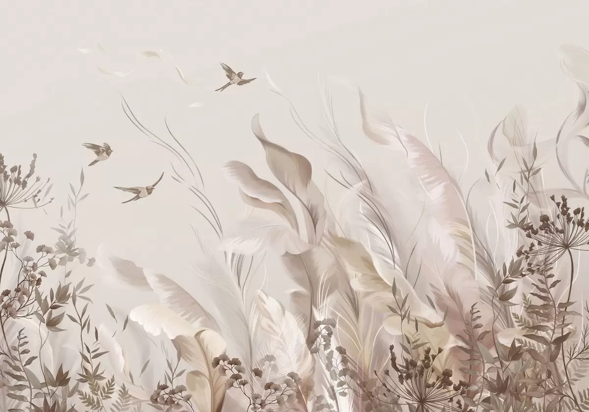Fototapet Pene delicate, ierburi și păsări în nuanțe deschise Nr. w05395