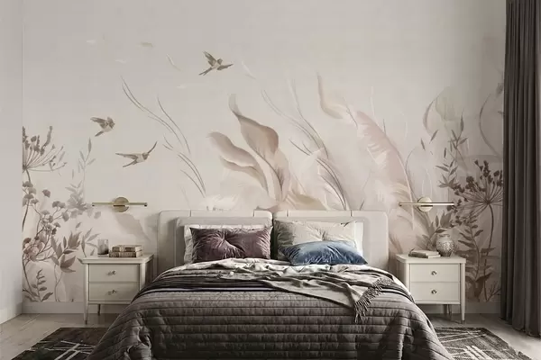 Fototapet Pene delicate, ierburi și păsări în nuanțe deschise Nr. w05395