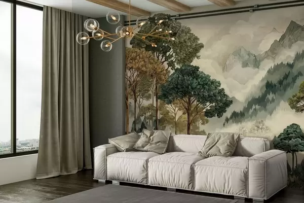 Fototapet Pădure cu copaci înalți în munții învăluiți în ceață Nr. w05410