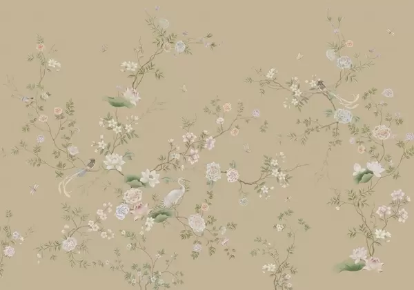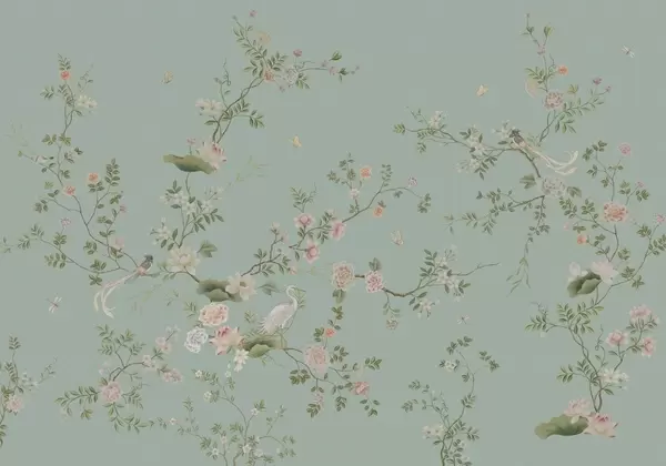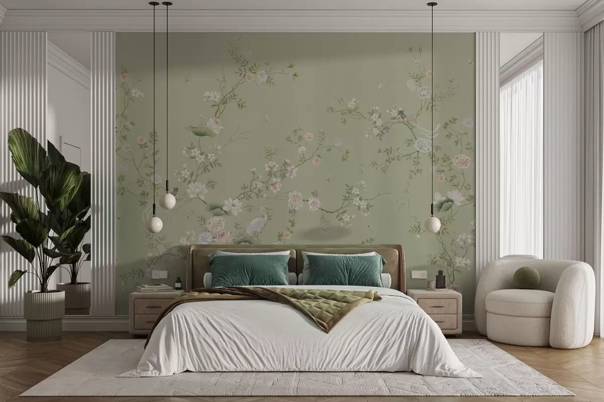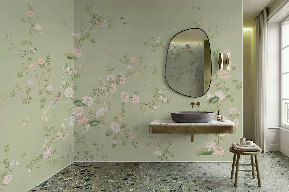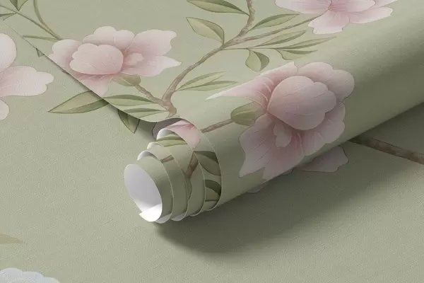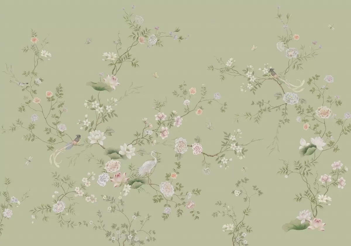 Fototapet Ramuri înflorite cu păsări pe fond verde deschis Nr. w05416