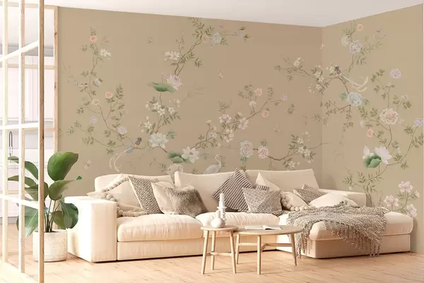 Fototapet Ramuri înflorite cu păsări pe un fundal bej cald Nr. w05416v2