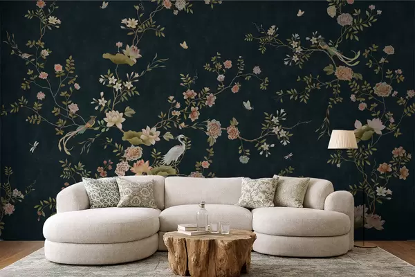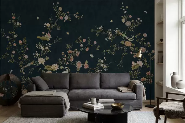 fototapet Ramuri înflorite cu păsări pe fundal întunecat w05416v3