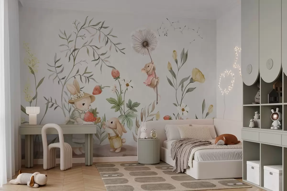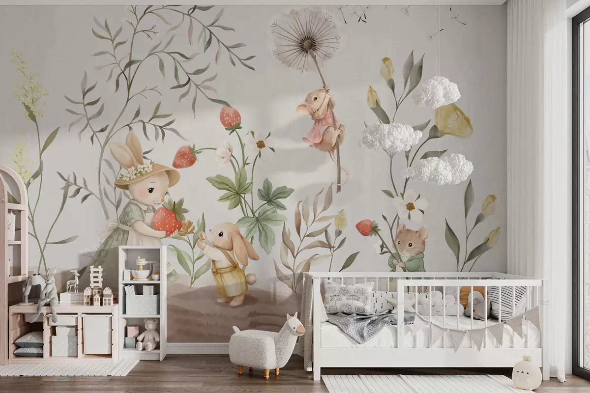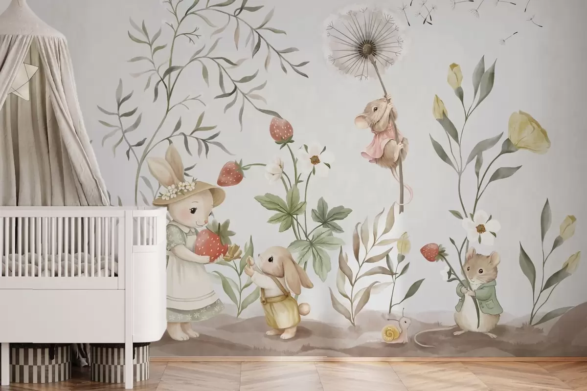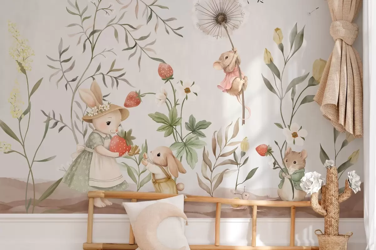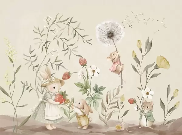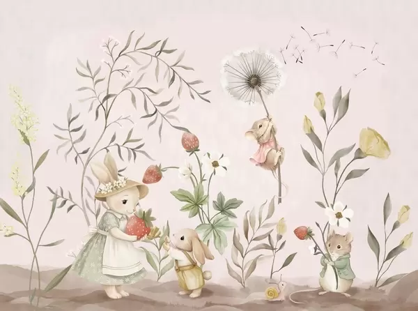 Fototapet Ilustrație pentru copii cu un iepuraș și un șoricel printre plante și flori Nr. w05422
