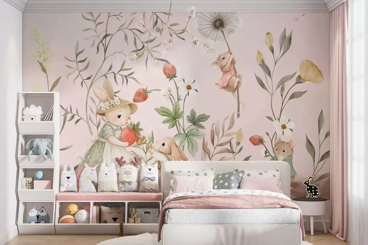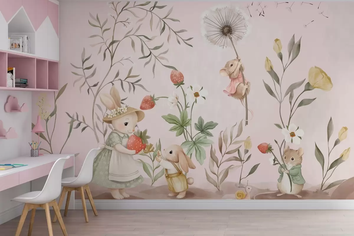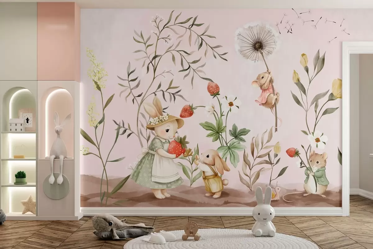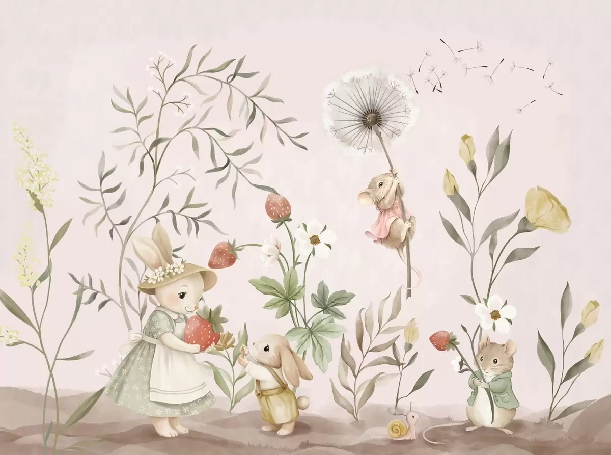 Fototapet Ilustrație cu animale și căpșuni pe un fundal roz pal Nr. w05422v1