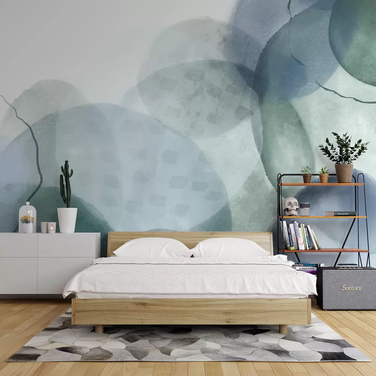 Fototapet Forme abstracte moi, în acuarelă, în nuanțe de albastru, verde și alb Nr. w07926