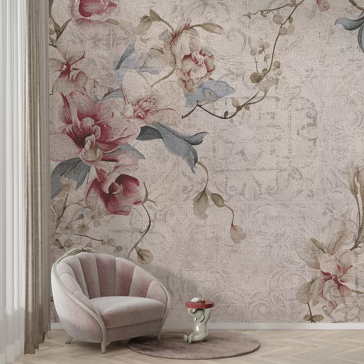 Fototapet Un model floral vintage cu flori roz și albe delicate, frunze pe un fundal bej deschis Nr. w08149