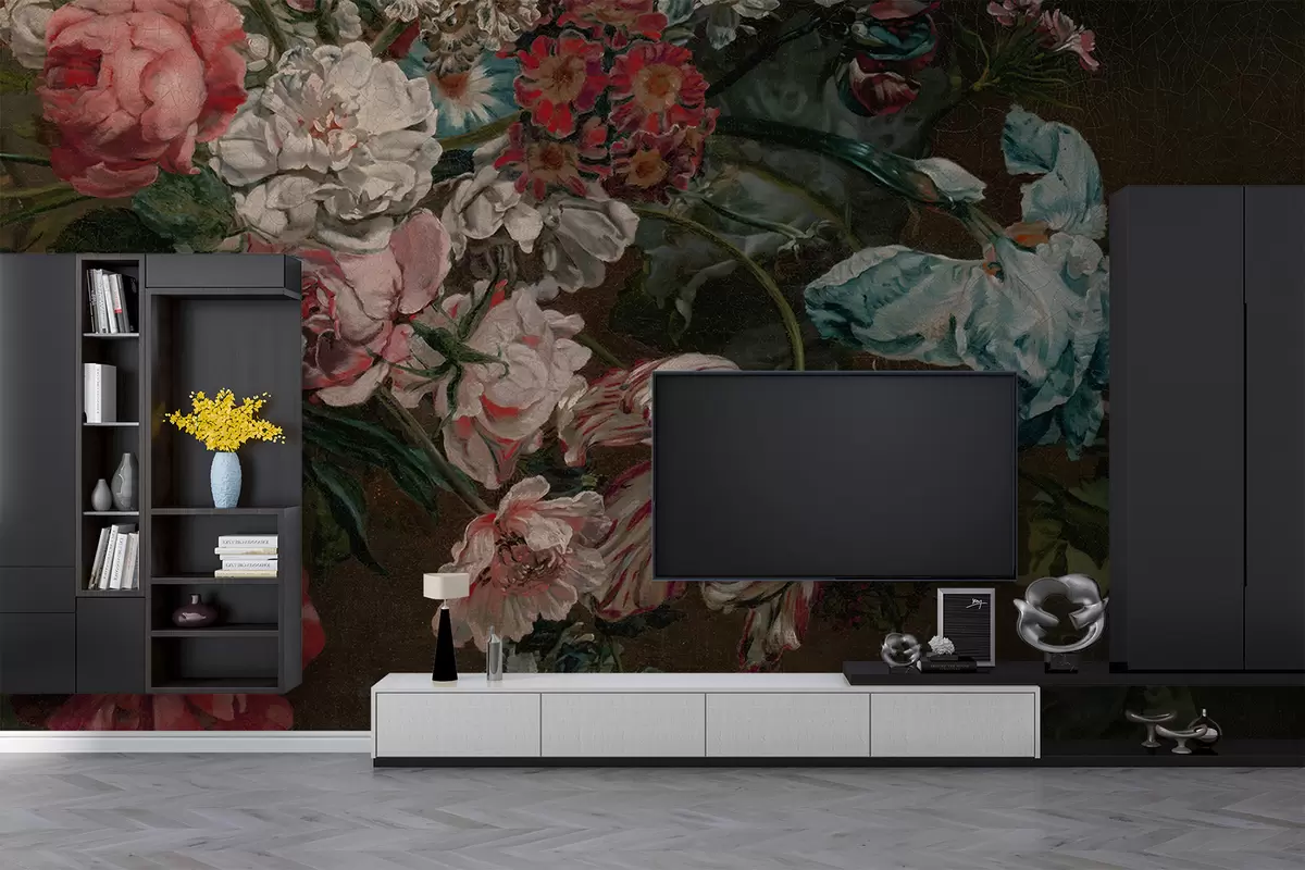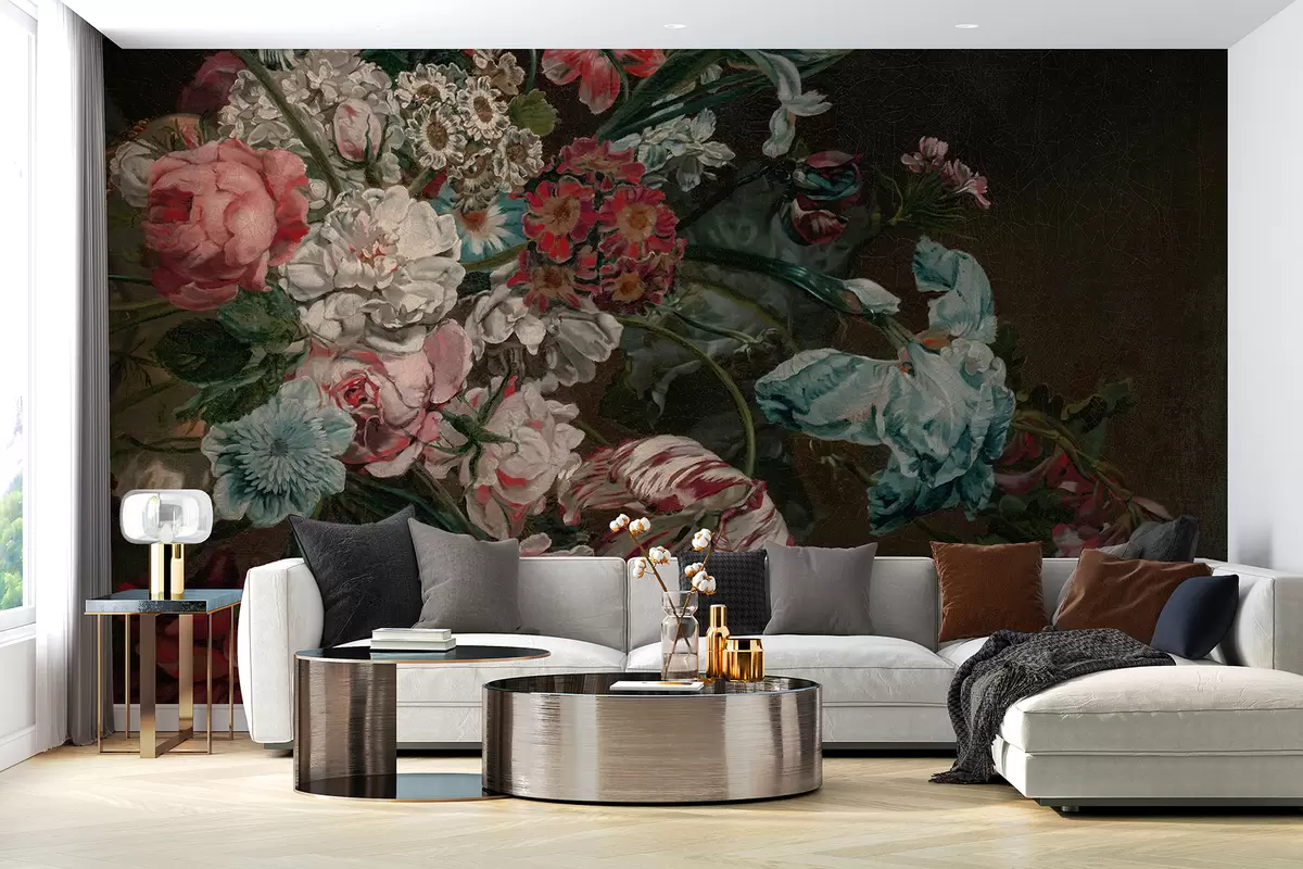 Fototapet Vintage flori colorate, inclusiv bujori roz, garoafe roșii, și crini albi pe un fundal întunecat Nr. w08163