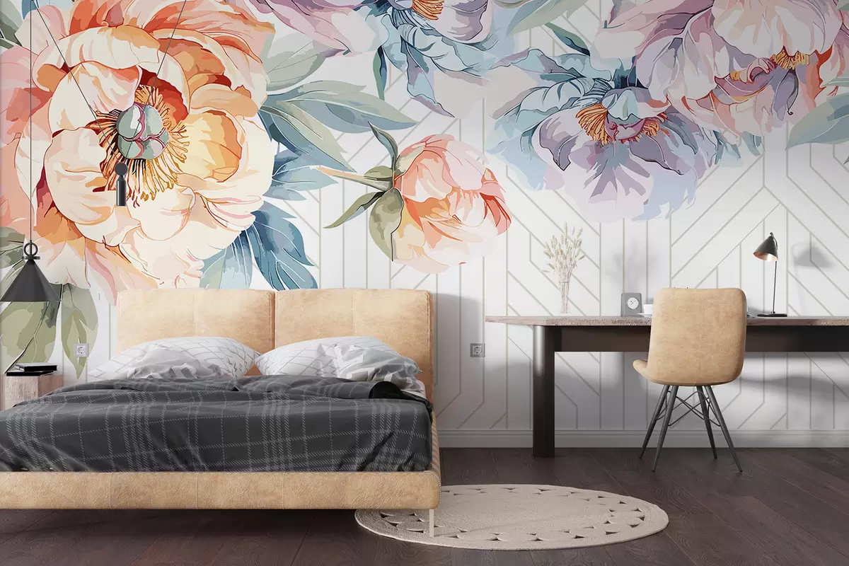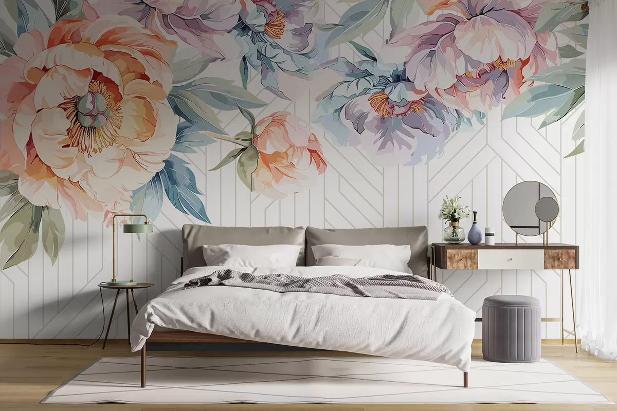 Fototapet Peonii abstracte vibrante piersici și roz cu frunze verzi pe un fundal alb și gri model Nr. w08183