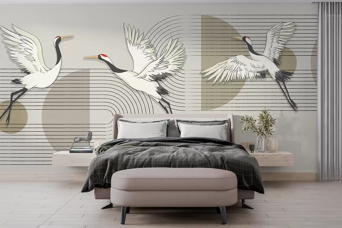 fototapet Trei cocori albi în zbor pe un fundal geometric minimalist cu cercuri concentrice w08188
