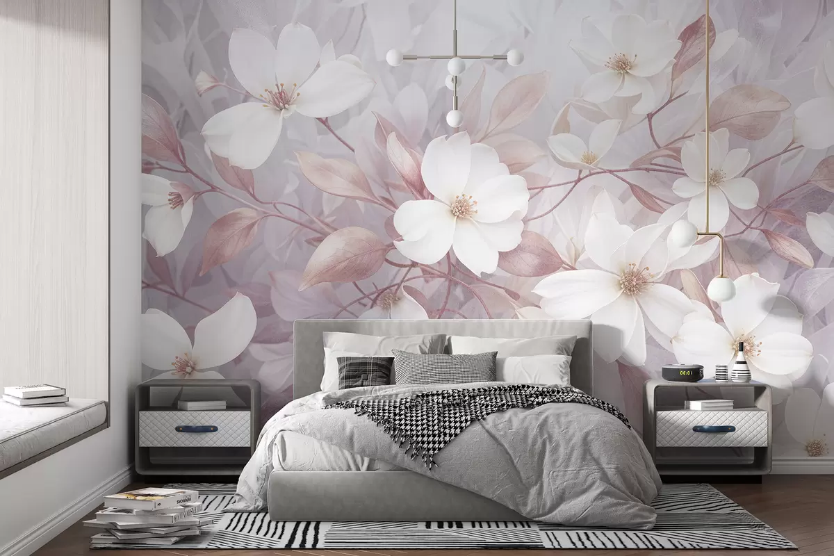 Fototapet Flori delicate de magnolie roz și albe care înfloresc pe ramuri blânde, neclare, pe un fundal palid Nr. w08196