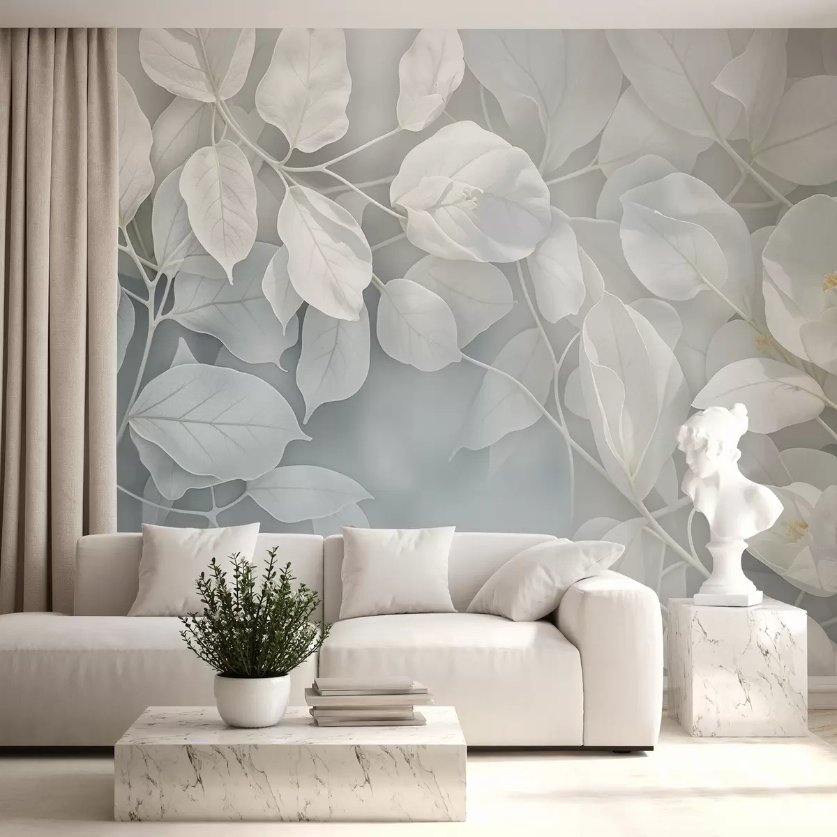 Fototapet Flori albe moi, delicate, cu frunze gri-verzui pe un fundal neclar, creând o atmosferă senină Nr. w08232