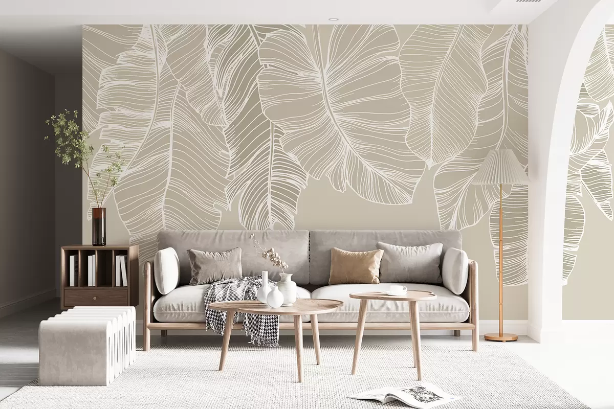 Fototapet Frunze florale tropicale albe cu fundal bej deschis, design minimalist în linie artistică Nr. w08235