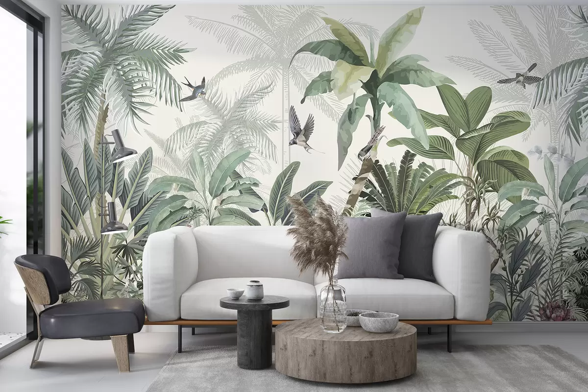 Fototapet O scenă luxuriantă de junglă tropicală cu diferiți palmieri, frunze mari și flori colorate în prim plan Nr. w08239