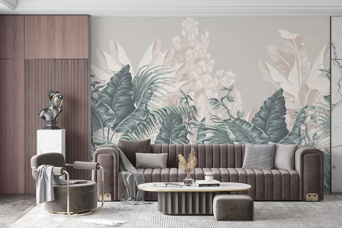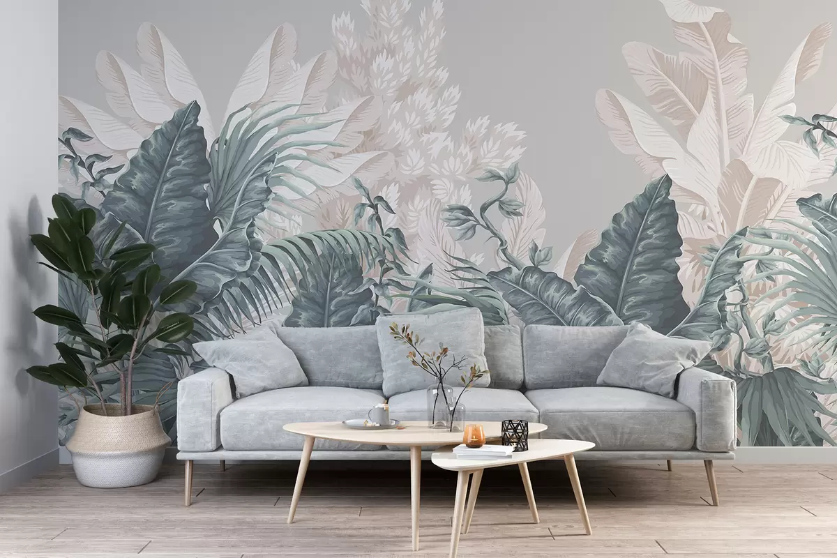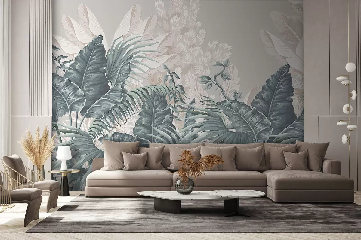 Fototapet O scenă de junglă tropicală cu frunze mari și flori verzi în prim plan, creând o atmosferă luxuriantă Nr. w08242