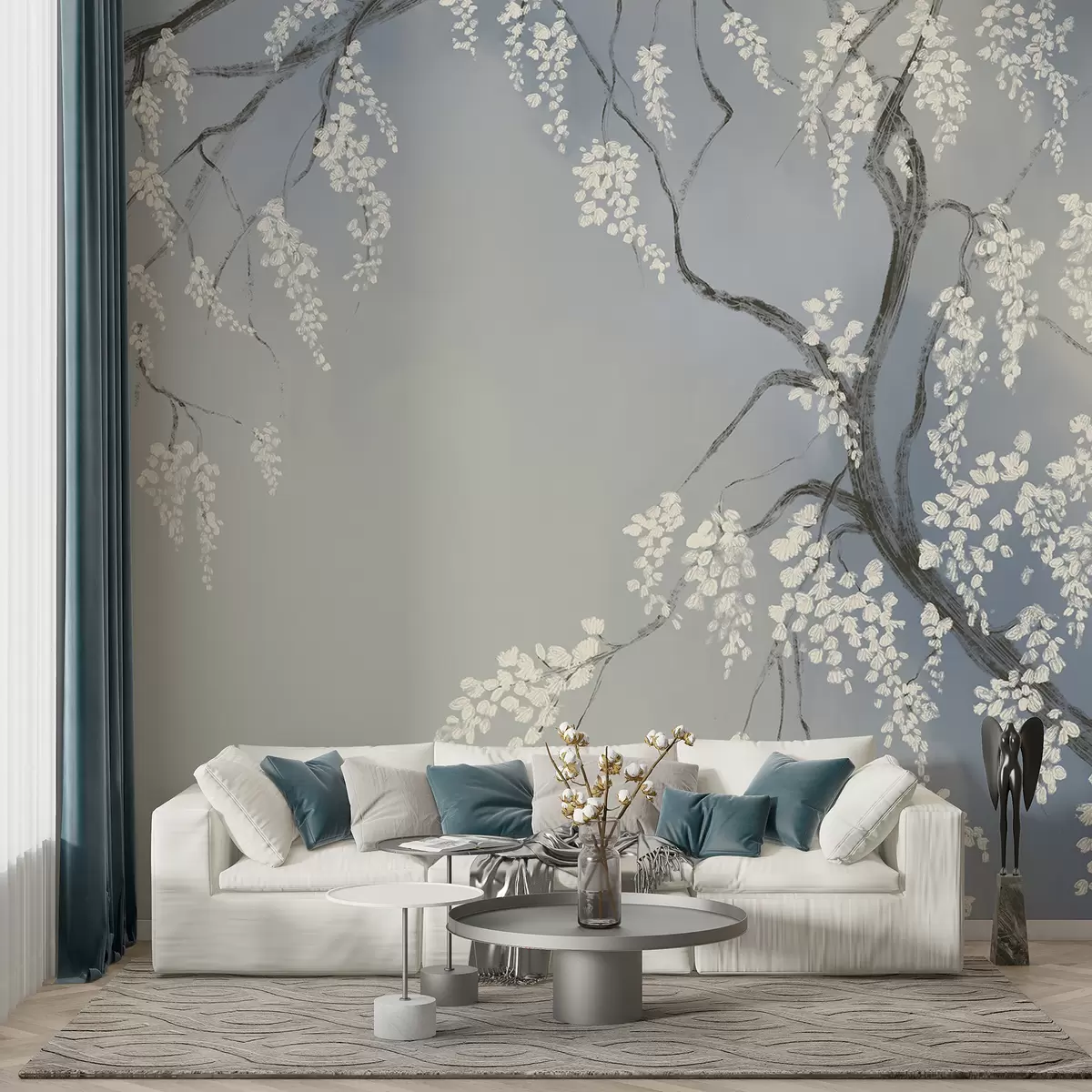 Fototapet Cireș alb delicat cu flori înflorite pe ramuri pe fundal albastru Nr. w08243v1