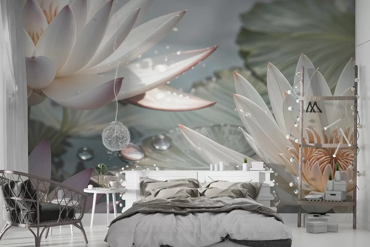 Fototapet Un prim-plan de flori de lotus albe cu picături de apă pe petalele lor pe un fundal verde neclar Nr. w08252