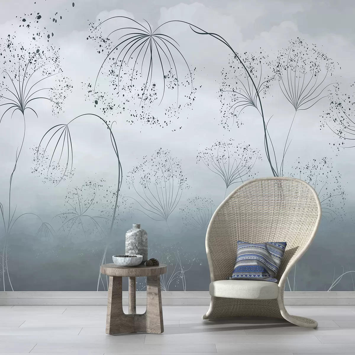 Fototapet Plante albastre, înalte și rarefiate, cu flori delicate, în formă de umbrelă sau capete de semințe, într-un mediu cețos, atmosferic Nr. w08258v1