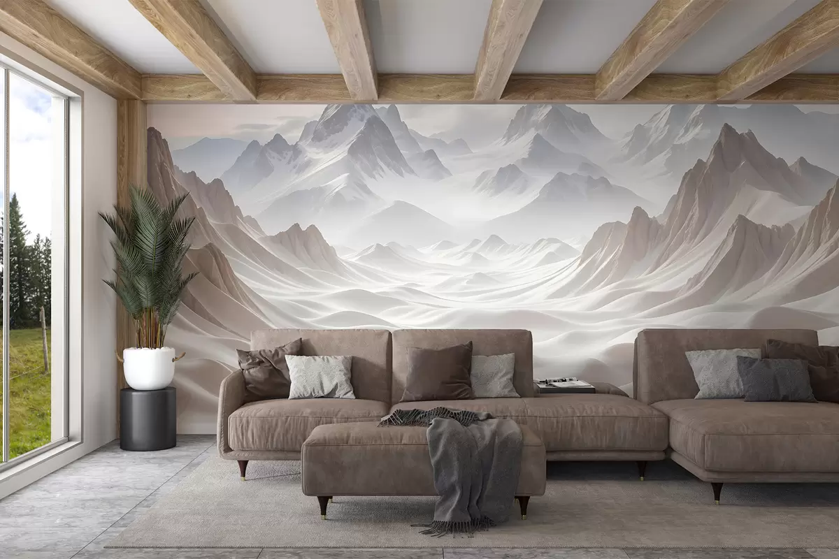 Fototapet Vârfuri muntoase înzăpezite care ies dintr-un peisaj cețos, eteric, cu dealuri și văi Nr. w08313