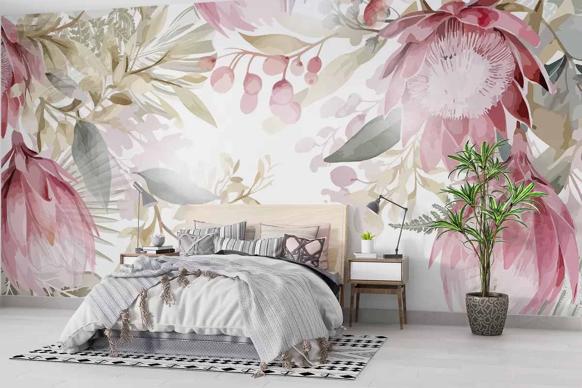 Fototapet Protee mari roz și albe transparente cu frunze verzi luxuriante pe un fundal deschis Nr. w08315
