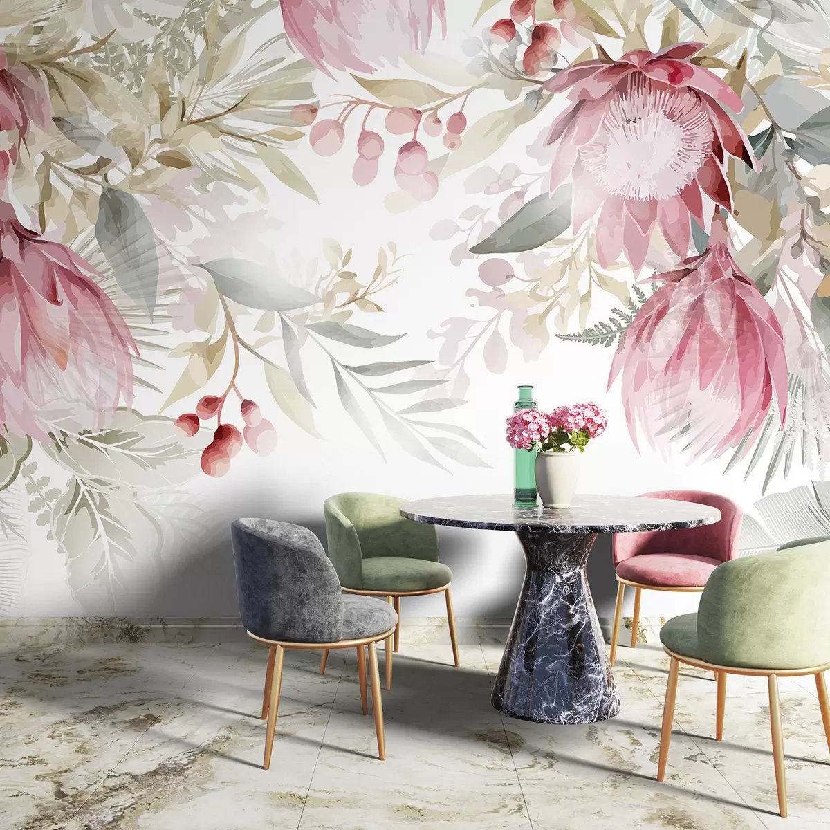 Fototapet Protee mari roz și albe transparente cu frunze verzi luxuriante pe un fundal deschis Nr. w08315