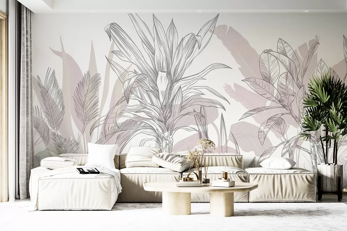 Fototapet Un grafic tropical plante cu frunze mari, luxuriante și flori în nuanțe de gri și alb cu siluete florale roz Nr. w08327v1