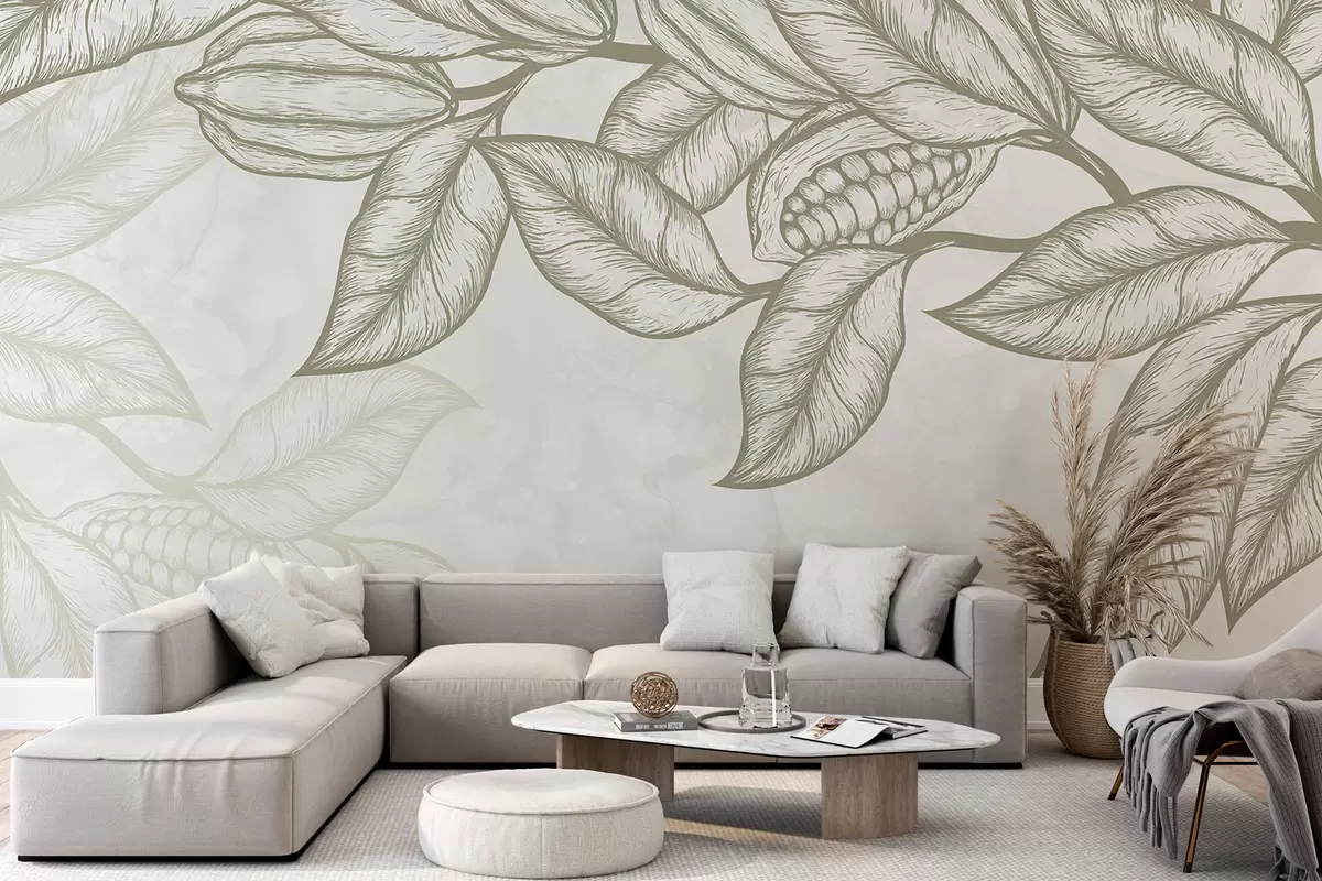 Fototapet Desen liniar detaliat al frunzelor și frunzelor de cacao într-o imprimare naturală, organică Nr. w08334