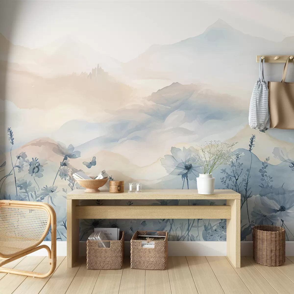 Fototapet Un peisaj senin cu un lanț muntos cețos în fundal, înconjurat de un câmp de flori albastre delicate Nr. w08339