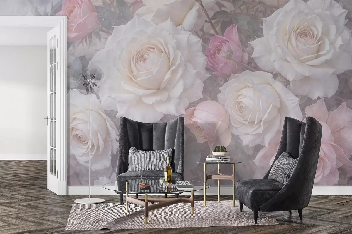 Fototapet Trandafiri și bujori moi, în culori pastelate, pe un fundal neclar, cu textură gri cețos Nr. w08352