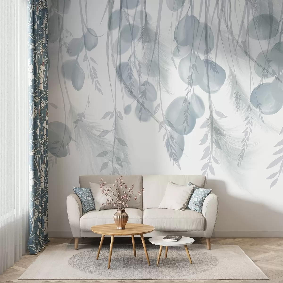 Fototapet Frunze delicate de eucalipt gri și verde pastel care cad, creând o atmosferă senină și liniștitoare Nr. w08380