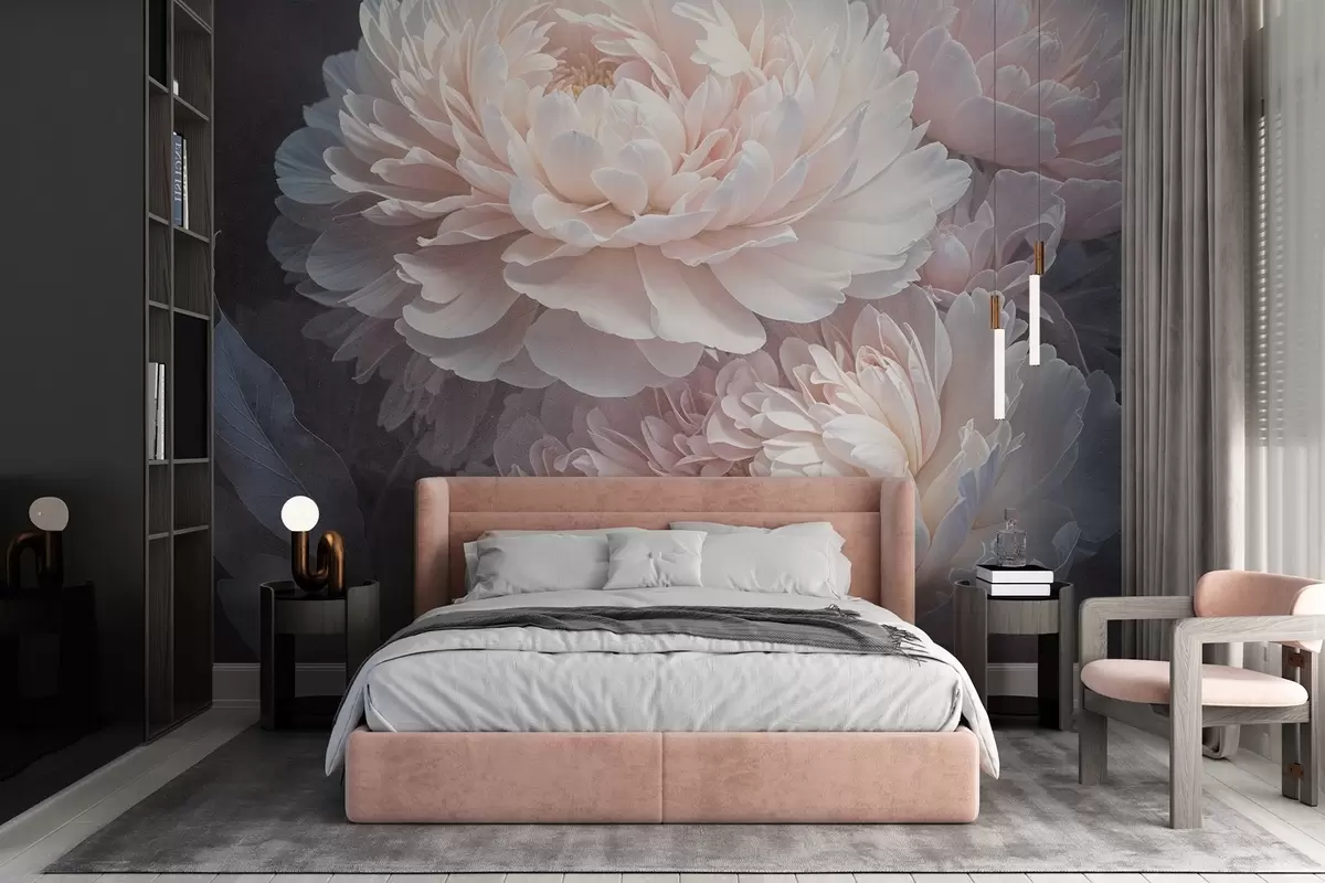 Fototapet Un prim-plan a două bujori roz mari, delicate, cu petale și frunze moi, pufoase, pe un fundal neclar Nr. w08382