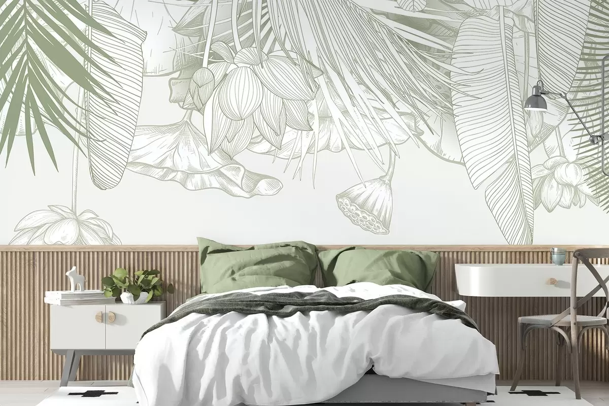 Fototapet O vedere de aproape a unui imprimeu floral verde cu petale și frunze mari, suprapuse, într-o culoare monocromă Nr. w08389v1