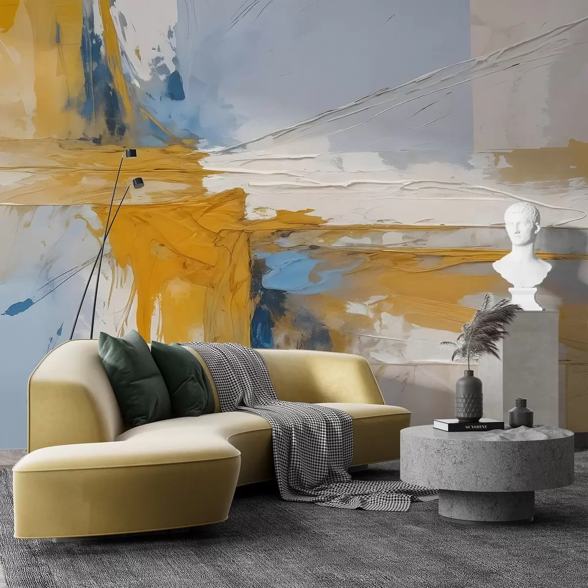 Fototapet Compoziție minimalistă de artă abstractă cu tușe îndrăznețe de vopsea galbenă, albastră și albă Nr. w08414
