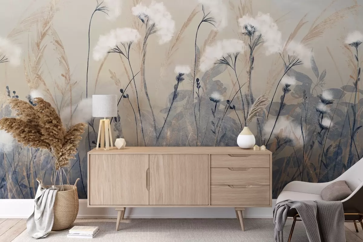 Fototapet Iarbă albă pufoasă de bumbac pe un fundal textural neclar, cu o atmosferă moale, cețoasă și senină Nr. w08416