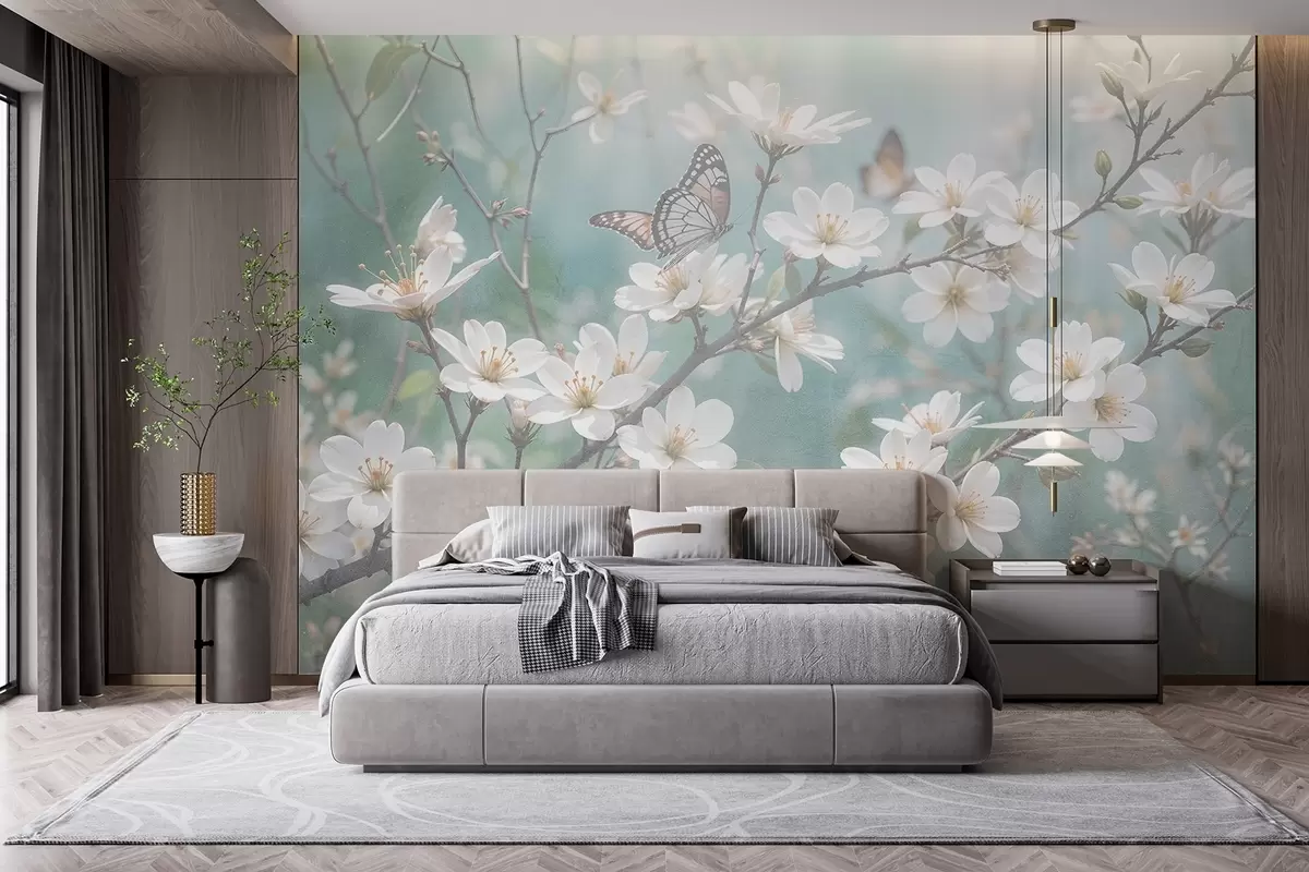 Fototapet Un fluture alb pe o ramură cu flori delicate de cireș alb în prim-plan pe un fundal neclar Nr. w08421