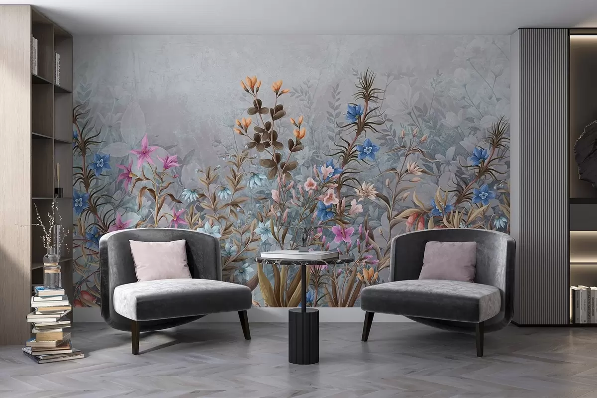 Fototapet O imprimare texturală florală luxuriantă, vibrantă, cu flori și plante colorate, cu detalii și texturi complexe Nr. w08428