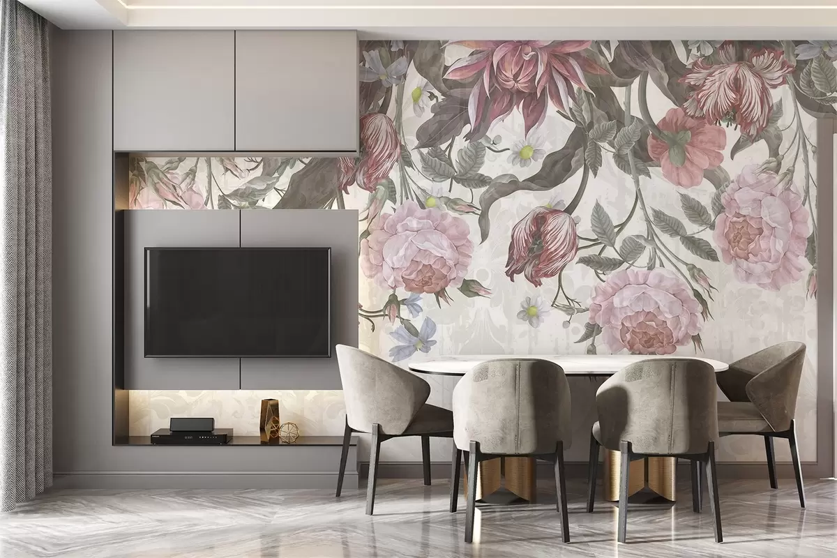 Fototapet Un aranjament floral luxuriant cu flori mari roz și albe, cu frunze și tulpini verzi Nr. w08435