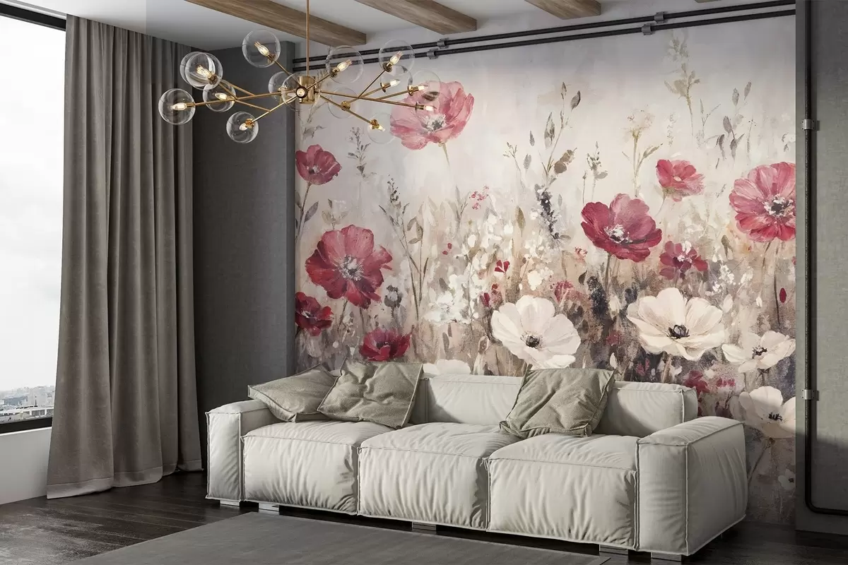 Fototapet Un câmp de flori roșii și albe vibrante pe un fundal moale, încețoșat în stilul picturii în ulei Nr. w08438