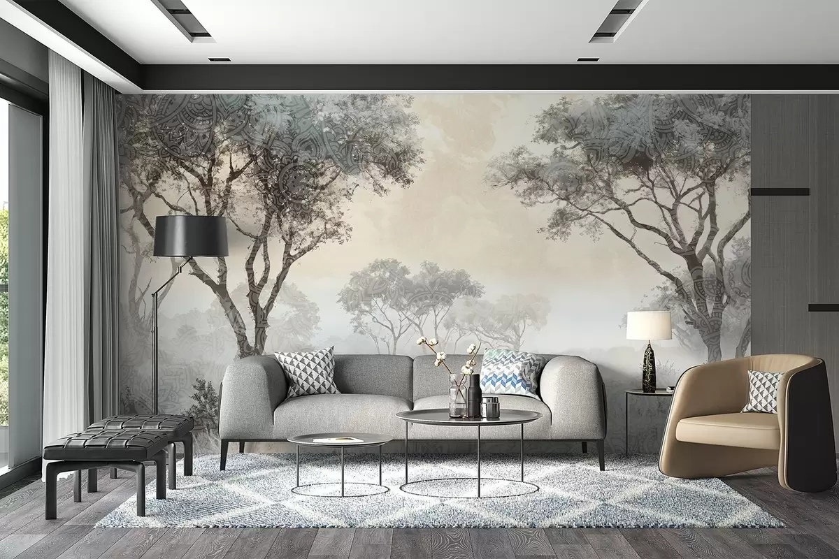 fototapet Un peisaj cețos, senin, cu copaci siluetați în prim-plan, cu ceață moale în nuanțe de gri și bej w08442v1